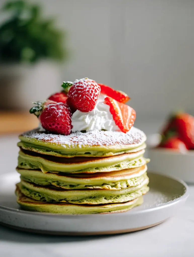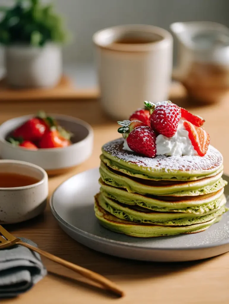 Keep your plating natural use ceramic dishes, a sprinkle of powdered sugar, and let the green tone of the matcha speak for itself. These pancakes don’t need a lot of extras to shine.