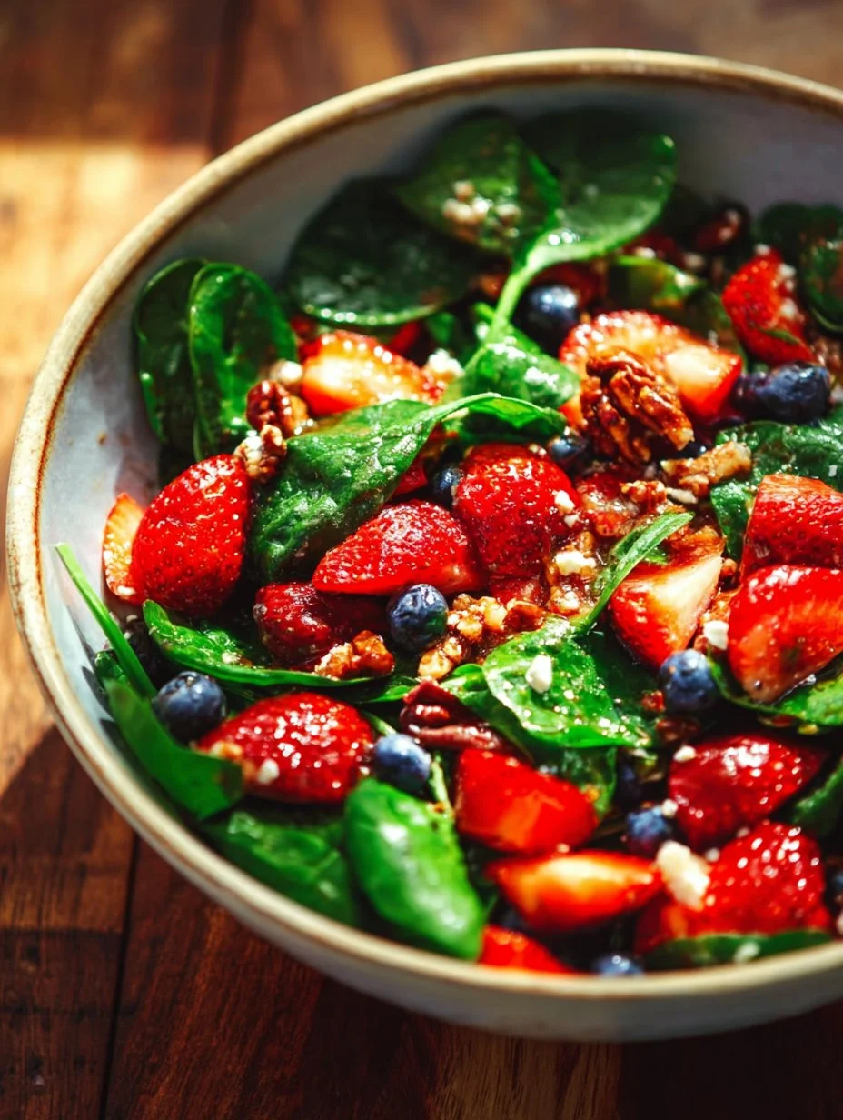 A refreshing Strawberry Spinach Salad bursting with sweet strawberries and vibrant spinach, perfect for springtime gatherings.
