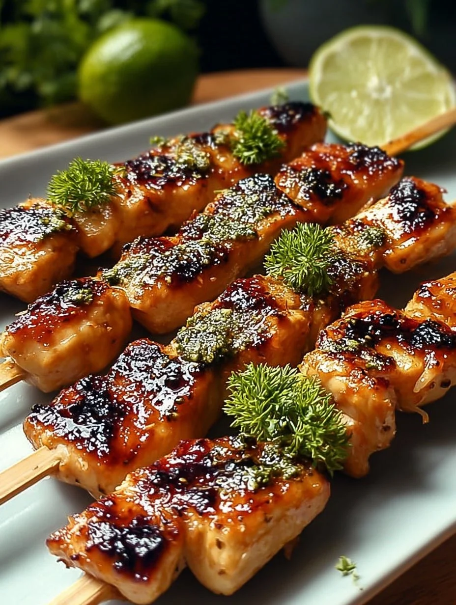 - Grill skewers for 8–10 minutes total, turning every 2–3 minutes, until lightly charred and chicken reaches 165°F internal temp. Brush with reserved marinade during the last 2 minutes.